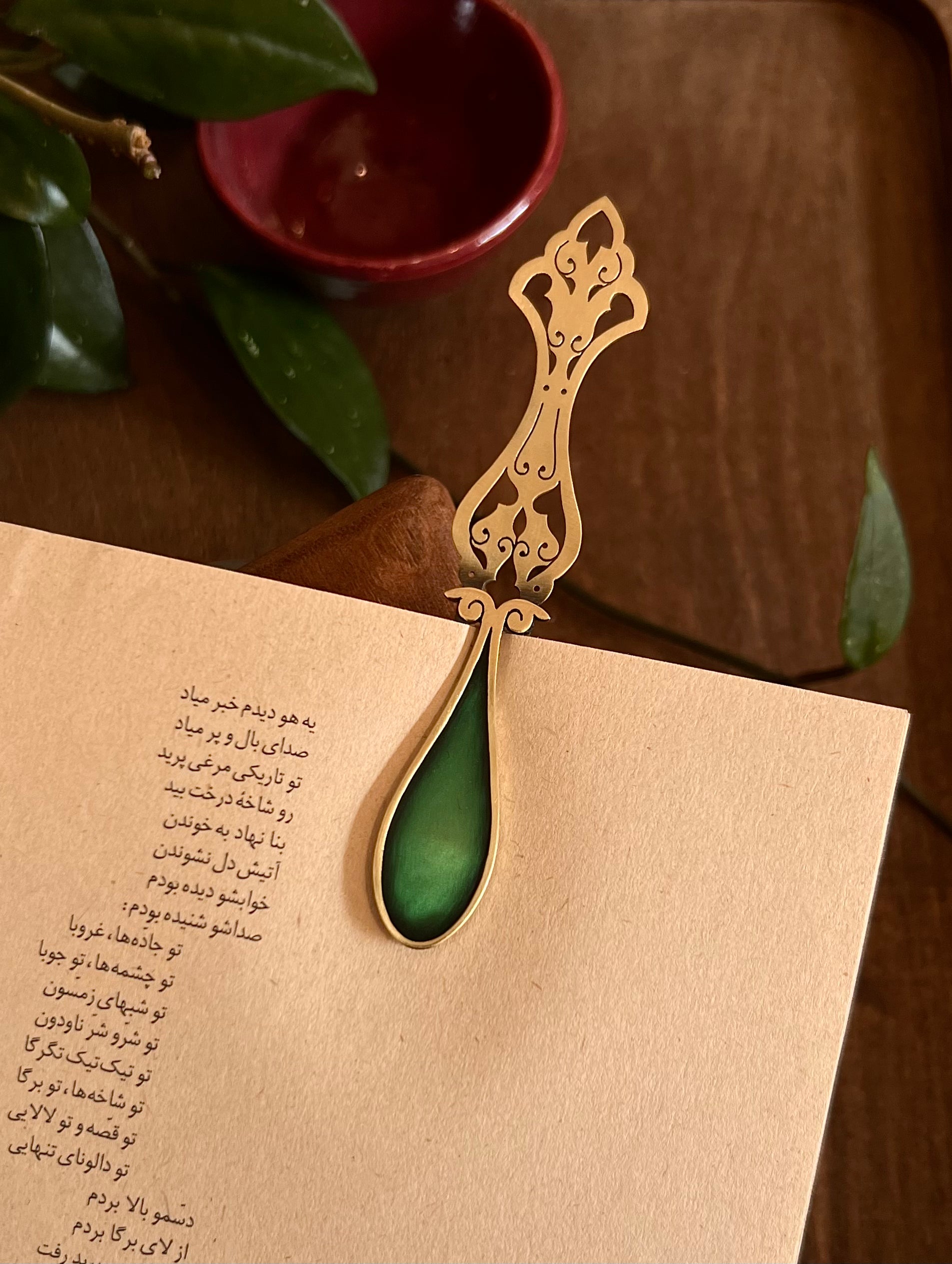 Handcrafted from polished brass and adorned with delicate enamel work, this bookmark captures the serene harmony of nature’s palette — soft greens and golden tones intertwined in artistic balance.